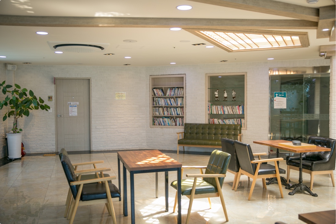 자연을 느낄 수 있는 하늘정원과 쉼터, 도서실, 사회복지실과 프로그램실 등 환자분들을 위한 공간입니다.